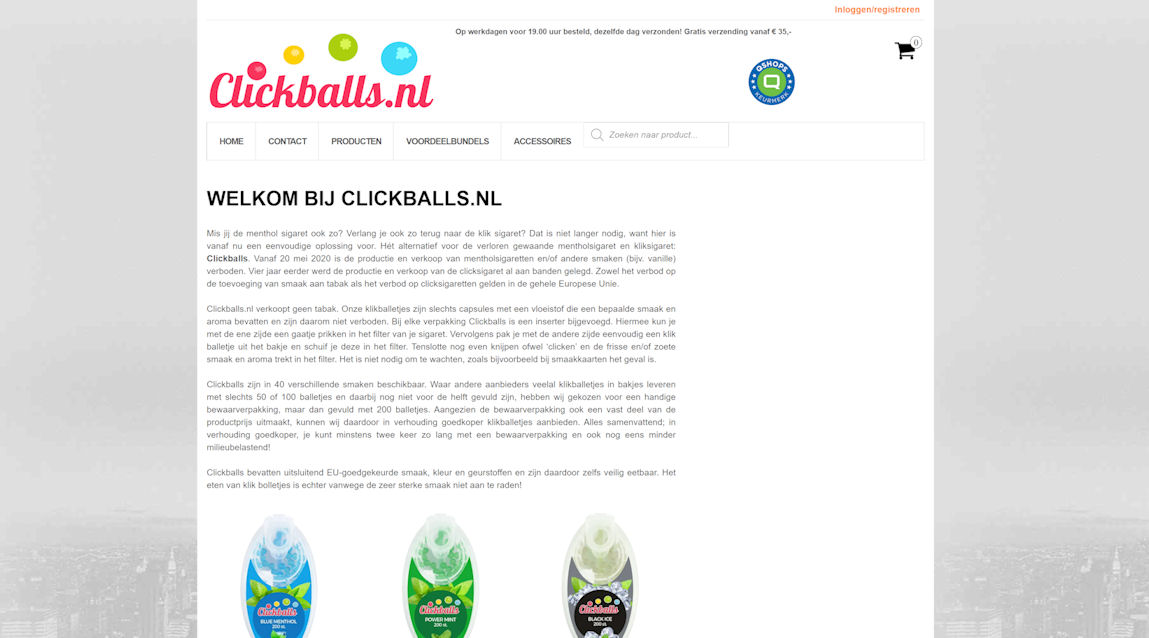 Naast onze hoofdactiviteit, de verkoop van laptoponderdelen en reparaties van laptops, verkopen wij ook Clickballs. Dit zijn smaakcapsules welke in het filter van een sigaret gestoken worden. Vervolgens dient in het filter geknepen te worden zodat het balletje knapt en de smaakvloeistof in het filter vrij komt. Jaren geleden was de zogenaamde 'kliksigaret' een revolutionair concept van de grote tabaksfabrikanten. Aangezien de verkoop van kliksigaretten immens populair werd, kwam er een Europees verbod op de productie en verkoop hiervan. Enkele jaren later werd ook de verkoop van mentholsigaretten, die al decennia lang verkocht werden, aan banden gelegd. Tabak met smaaktoevoegingen behoorde tot het verleden, dit uiteraard tot zeer grote teleurstelling van voornamelijk de rokers die al jaren menthol rookten. De tabaksbranche kwam wel met enkele creatieve alternatieven, zoals de verkoop van losse filterhulzen met daarin een klikballetje, en daarnaast met zogenaamde 'smaakkaarten', Een dergelijke kaart dient in een pakje sigaretten gestoken te worden en vervolgens 60 minuten wachten voordat de mentholsmaak goed in de sigaretten is getrokken. De losse filterhulzen zijn in principe een prima oplossing voor de rokers die allang gewend waren aan het maken van hun eigen filtersigaretten. Voor de roker die liever geen gedoe wil met het zelf maken van filtersigaretten, en liever 'gewoon' een pakje sigaretten wil kopen, zijn de losse filterhulzen met klikballetjes natuurlijk niet het beste alternatief. Daarnaast hebben de smaakkaarten het nadeel dat eerst minstens 60 minuten gewacht moet worden voordat de smaak goed in de sigaretten is getrokken.
